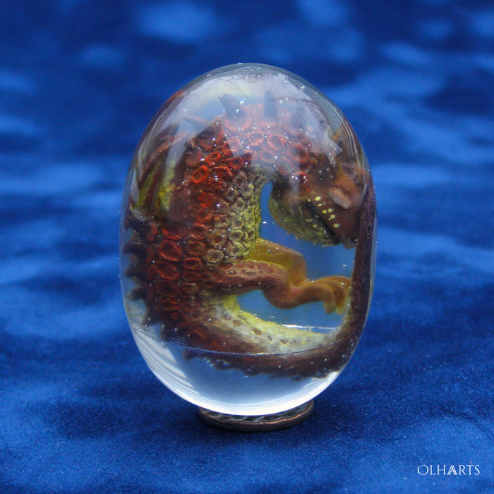 Заливка эпоксидкой. Первый раз в жизни с ней работала, руки тряслись, жутко боялась напортачить. Не все получилось идеально, на фото видно много пузырьков, осевших на внутренней поверхности яйца. Это не считая «пояска» по экватору и границы первого и второго слоя. Плюс смола при высыхании уселась, образовав каверну на навершии яйца. Все это пришлось стачивать.