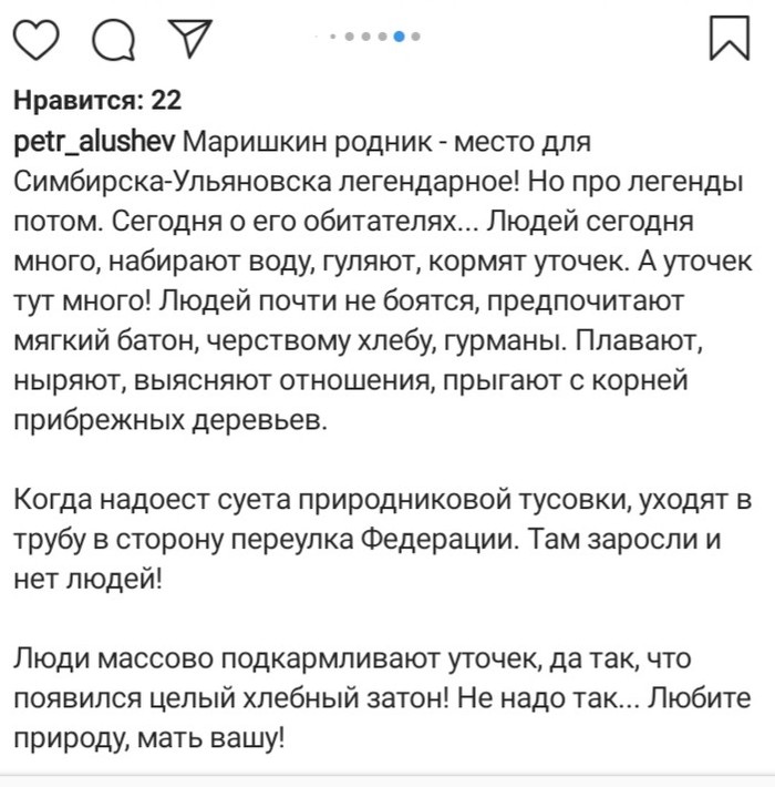 Давать уткам с утятами хлеб – это как закармливать человеческих детей булками из Макдональдса, чуть подпорченными, или только шоколадной помадкой. Много и регулярно. А потом вдруг бросить этих детей и оставить голодать. Сразу-то они не погибнут, но нормальную еду есть перестанут, обмен веществ необратимо пострадает, дети станут вялыми и нездоровыми, у них обязательно возникнут сопутствующие болезни ЖКТ. А оставшись без привычного прикорма выживут уже совсем немногие…