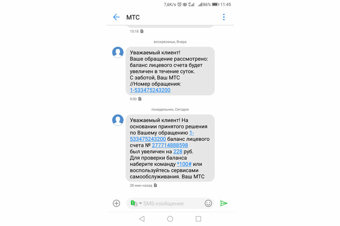 На следующий день на мой основной номер пришла СМС, что обращение рассмотрено, а вчера на счёт вернули 228 рублей.