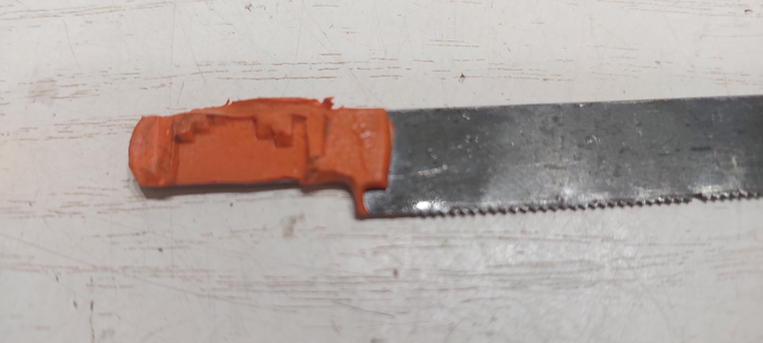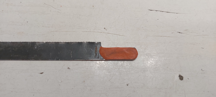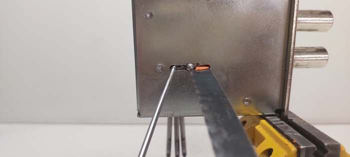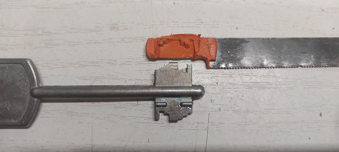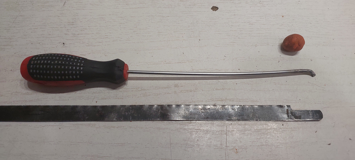 Крючок сделанный из длинной тонкой отвертки, пильное полотно по металлу и кусочек пластилина.