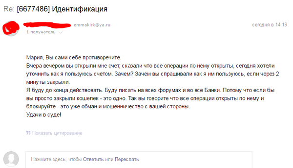 Они сами себе противоречат!! Они МОШЕННИКИ, получается?? Потому что никаких движений по кошельку после вечерней разблокировки не было, а они просто его утром заблокировали!!!!!