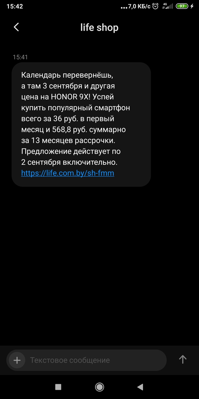 3 barmaleiko От этого не скрыться... 5 лет назад Только я установил в игноре тэги "3сентября", "Шуфутинский" (потому как заебало!!!) и т.п. как на телефон пришла смс от оператора "Life" (Беларусь) Оригинальней нельзя придумать. Это пиздец, товарищи. Показать полностью 1 [моё] Проклятие 3 сентября Не скроешься Каждый год Скриншот Мат Ещё 0