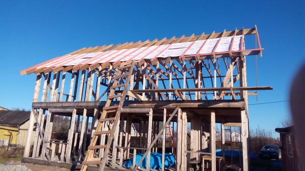 А вот дальше начался процесс подъема и установки стропил. С одной стороны стропилу подымал, ведя конец по лестнице, заводил на конек и потом второй конце на стену, ставил запилами на место, и шел на другую сторону. Там посложнее, привязывал вервеку к одному концу, веревка перекинута через конек, тянем-потянем, опять цепляем край за конек и дальше по отработанной технике. А дальше закрепляем все на саморезы и передвигаем лестницу на следующую пару.