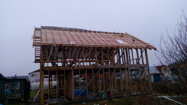 Вот теперь, уже можно не опасаться, что в процессе закидывания стропил от натуги чего-нибудь выпадет, по крайней мере добежать можно.