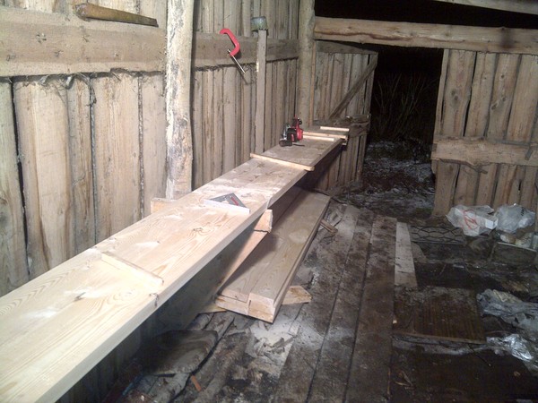 И вот ближе к концу декабря я принялся за стройку. Сделал верстак в старой сарайке, доставшейся от прежнего владельца. Под верстаком можно увидеть часть напиленных стоек для будущей стены.
