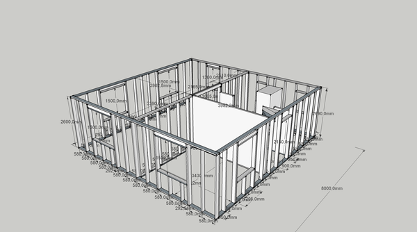 Собственно сам процесс возведения каркаса достаточно прост: стена собирается в лежачем положении на фундаменте и затем поднимается и устанавливается на свое место. Отталкивался я от чертежа, находящегося в открытом доступе, называется "Ямуга-115М". Но в процессе модифицировал, так что практически ничего не сделано по нему. В частности, в проекте стойки поставлены с расчетом на то, что дом снаружи будет обшит OSB, я от этого отказался сразу, поэтому стойки рассчитал просто под утеплитель. Так же по ходу строительства создавалася модель в Google SketchUp.