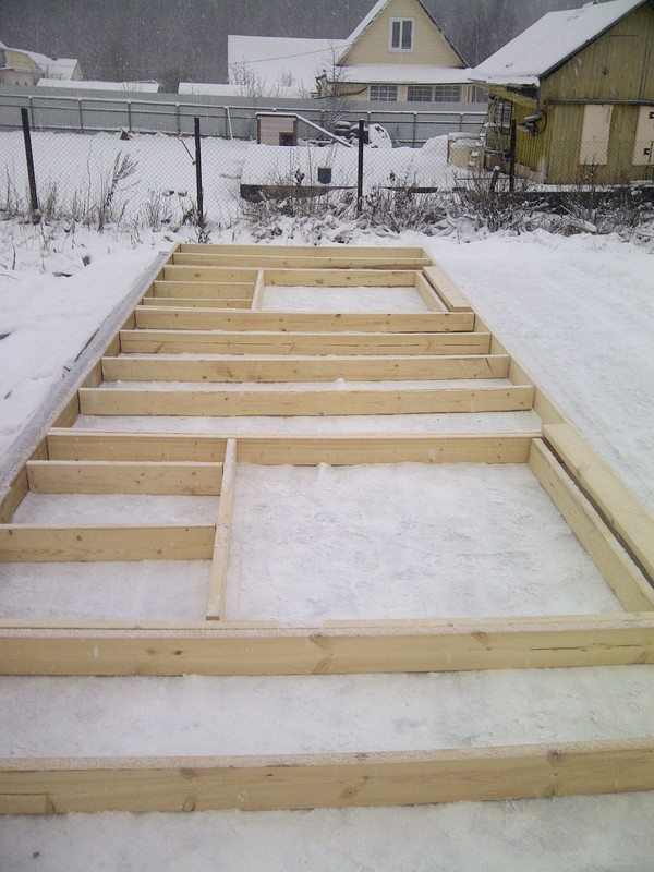 Вернемся к делу. Первая стена делается, все стойки напилены, оконные проемы сделаны (оконный проем сопровождается двойными стойками и хидером, который должен передавать нагрузку именно стойкам, а не окну). Выкладываю её на фундаменте (помним, что дело в конце декабря, так что фундамент покрыт слоем снега). Кстати, нижняя доска - как раз импрегнированная, она темнее (на деле зеленоватый оттенок имеет).