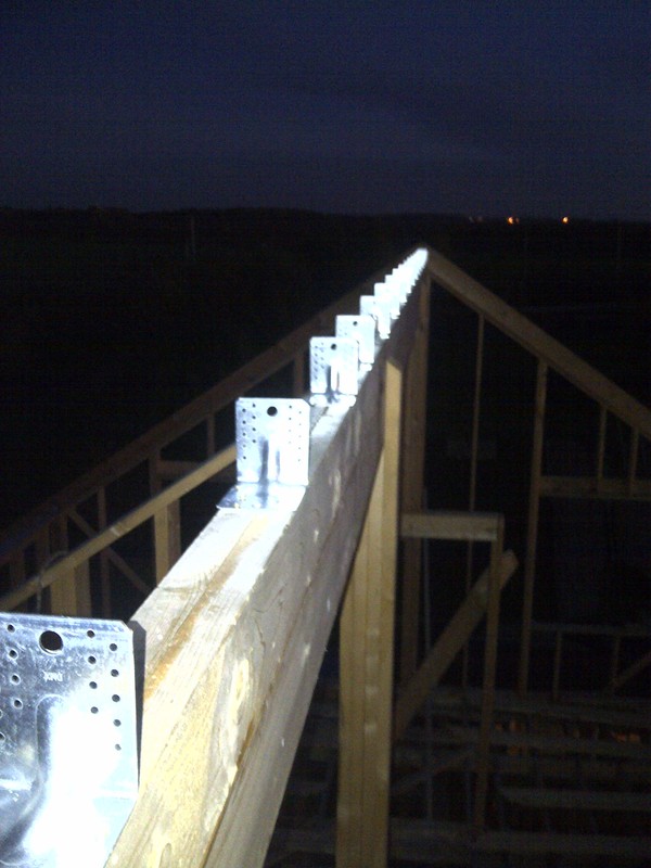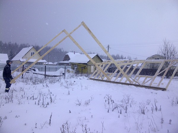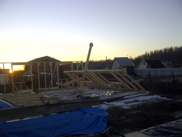 В общем, позвал я соседа на помощь, постояли мы, подумали, что даже если поставить стойки, то как эту дуру 12м подымать на высоту 4м. Решили, что никак. Нужно делать фронтоны и по ним уже затаскивать.