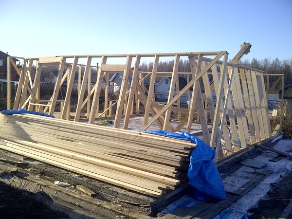 Что нам нужно? Всего-то около 40 6-ти метровых досок, в которых сделать специальные запилы под конек и стену. И закинуть их.
