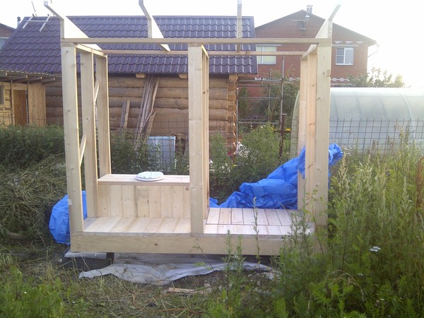Стройматериалы стали подходить к концу, на вторую мансардную стену уже не хватало. Так что из остатков и обрезков по мотивам того, что было сделано в деревне за два дня без нормальных инструментов, решил соорудить более приличное заведение, да еще и с бонусным душевым отделением.