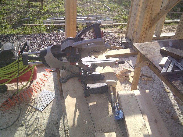 Для фронтонов стойки нужно торцевать под углом. Я подумал, что без торцовочной пилы не обойтись и напряг соседа. В итоге получил вот это: