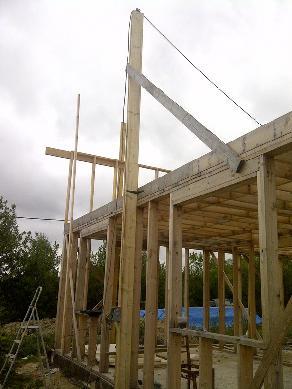 Дальше я собрал противоположную этой стену. К сожалению, фоток в нормально качестве нет. А так же нет последующих фоток, как я подымал эти стены. Но это и не важно. Был собран кран неудачной конструкции, который приходилось пододвигать к стене по мере её поднятия (а в это время стену нужно как то удерживать - подпорками и человеками). А главное что, после поднятия этих стен в стройке наступил перерыв до весны. А к весне обе стены упали, не без последствий (одна стена упала даже два раза, так как я её подымал обратно). Причина тому проста - я не закреплял стены. Вообще никак, они держались лишь на подпорках. Ну а пару раз были ураганные ветра, вот они и попадали.