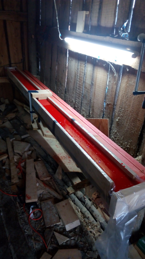 Вон он, на перекрытии лежит... Этакая дура 12 метров в длину, в две доски толщиной и в ширину: одна доска 145, вторая 195. Итоговое сечение: 340х90мм. И все это склеено и сбито гвоздями.