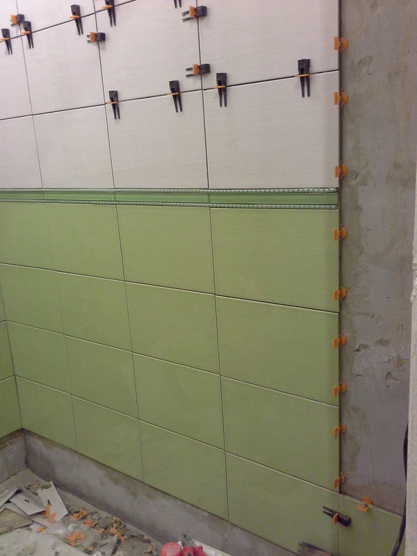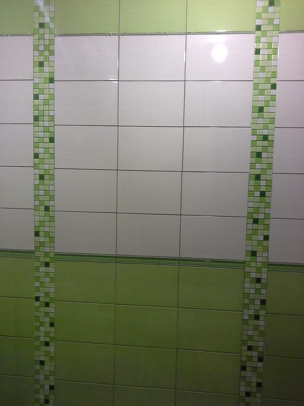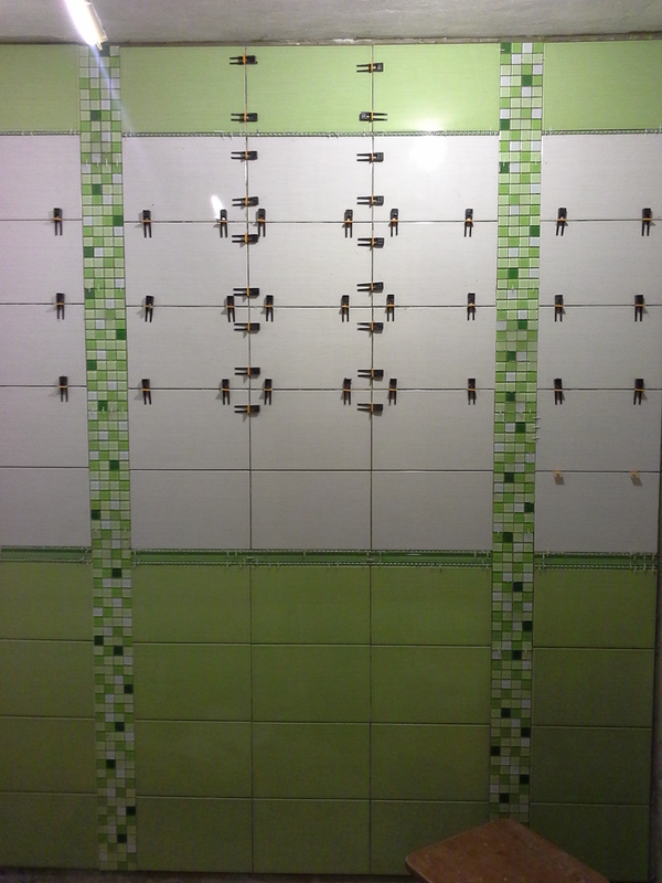 Побелка счищена, в стенах дырки заделаны, все загрунтовано. И так приступаем к укладке плитке. За ванной нижний ряд не стал укладывать. Выбор цвета плитки пал на фисташковый. Сама плитка довольно бюджетная, но об этом далее. Так же решено было украсить стены мозаикой и бордюрами. Размер плитки 20х30см. Размер стены 1,7м потому укладка первой стены прошла без подрезки.
