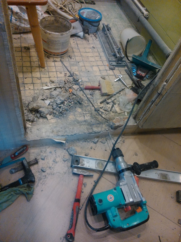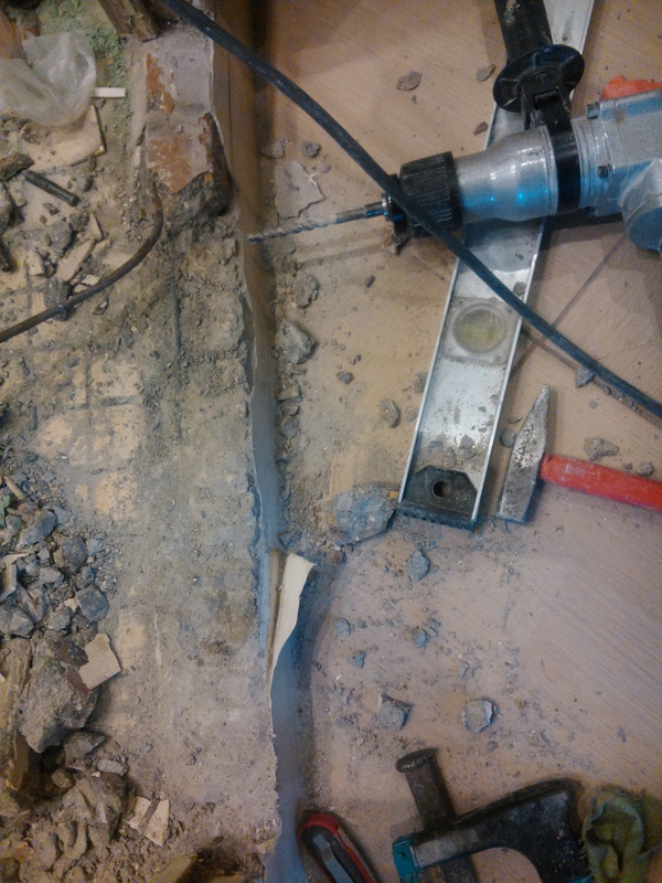 Порог решено было убрать и сделать в уровень с полом в ванной. Занятие как оказалось то еще, В отличии от стен самой коробки которые были из гипса, поддон был бетонный с гранитным щебнем. Но останавливаться было поздно.