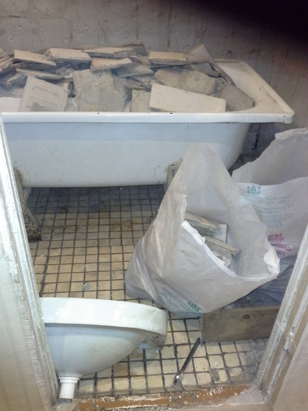 Вывоз старой плитки, ванны и раковины у меня занял почти целый день. Было сделано 6 ходок по два мешка на мусорку.