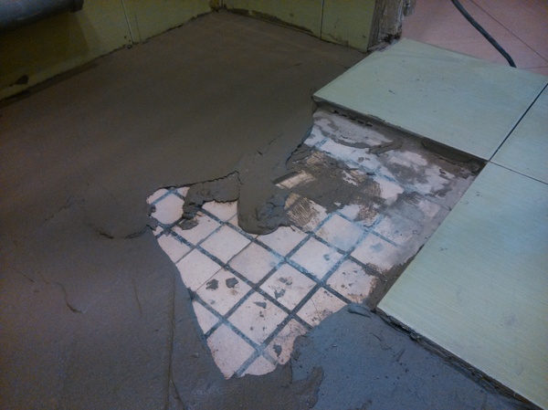 Плитку старую снимать не стал, а новую начал класть от порога, поэтому уровень плитки пришлось выравнивать от него. А так как слой плиточного клея получался довольно большой, решено было сделать небольшой слой стяжки.