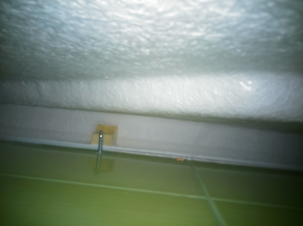Поэтому с горем пополам, на ощупь, разводным ключом саморез-костыль наконец чудом был установлен в нужное положение. Его положение контролировал просунув под ванну телефон и сфотографировав место крепления. (кому не понятно, это сфотографирована ванна снизу и стена к которой она примыкает).