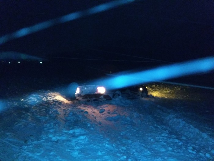 И вот спустя 20 минут мы уже наконец вылетаем, теперь хорошенько, прям с холмика. Лежит значит машина наискосок в снежочке. Связи нет, проежающих машин нет. Ладно хоть не перевернулась. Прошлый мужик вернулся за нами и смог нас выпрямить, но там холм на который нужны мощи уже экскаватора...