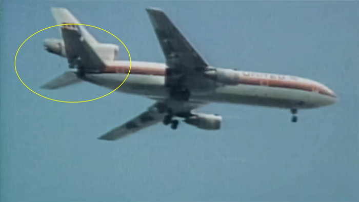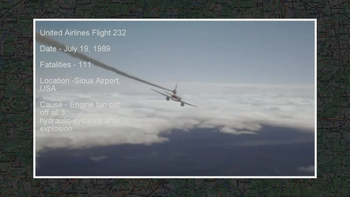 "На борту самолета DC 10 авиакомпании United Airlines находились 11 членов экипажа и 285 пассажиров. На высоте 11300 метров произошло разрушение ротора двигателя № 2, а его осколки разлетелись на большой скорости, повредив трубки высокого давления всех трёх гидросистем. В результате экипаж потерял возможность управлять всеми рулевыми поверхностями самолёта. В этот момент самолет находился в правом крене, который после потери управления стал увеличиваться. Командир, снизив тягу левого двигателя и увеличив тягу правого сумел стабилизировать самолёт и вывести его из крена. В тот момент двигатели на крыльях были единственными управляемыми элементами самолёта".