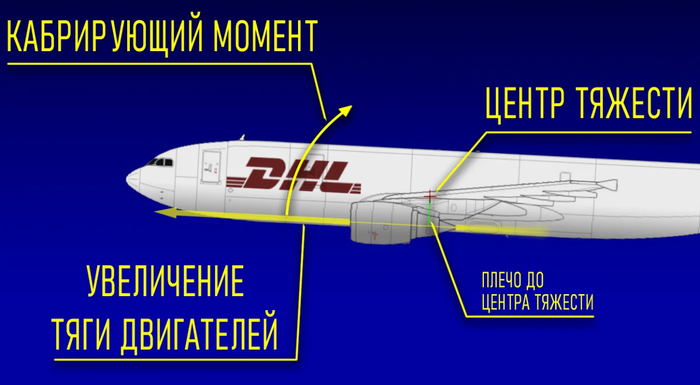 Двигатели расположены на крыльях ниже центра тяжести самолета. При увеличении тяги самолет испытывает кабрирующий момент на плече до центра тяжести, а при уменьшении – пикирующий. Поиграв с тягой, можно найти золотую середину, такие значения тяги и скорости полета самолета, при которых он летит без набора высоты и без снижения.