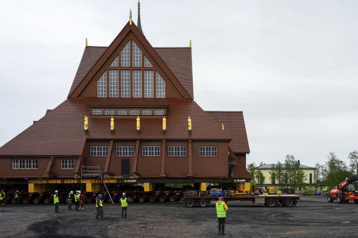 Церковь Кируны на этой неделе переносится на 5 километров в рамках программы переселения города. Это происходит из-за того, что крупнейший в мире подземный рудник по добыче железной руды грозит поглотить город.