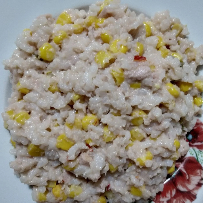 200 грамм риса нужно промыть и отварить, добавить в него банку кукурузы (не саму банку - открыть её, воду там слить, кукурузу уже высыпать, хотя если кому железо нравится, то делайте как хотите), колбасу добавить, избавив от упаковки и нарезав кубиками.