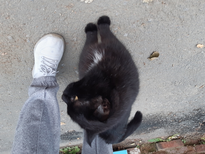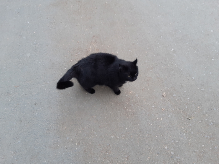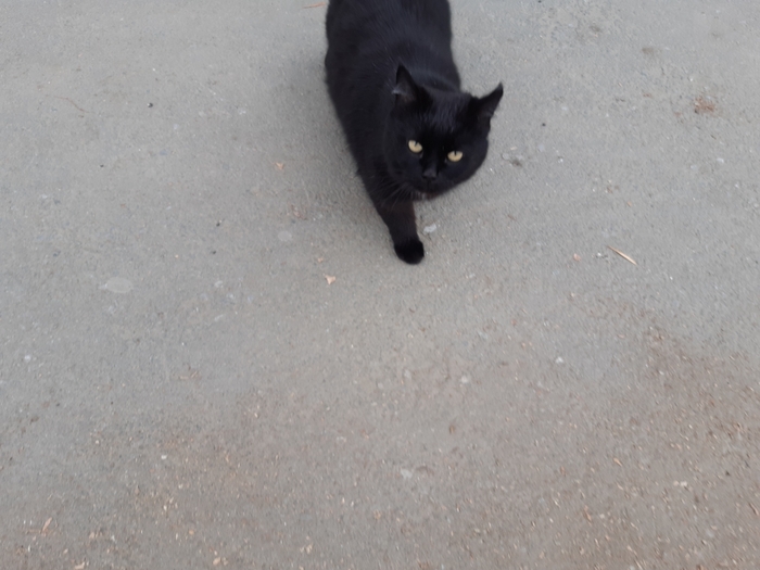 Кот, чёрный, белое пятно на шее и на животе. Глаза жёлтые. Крупный. Чистый, явно домашний.