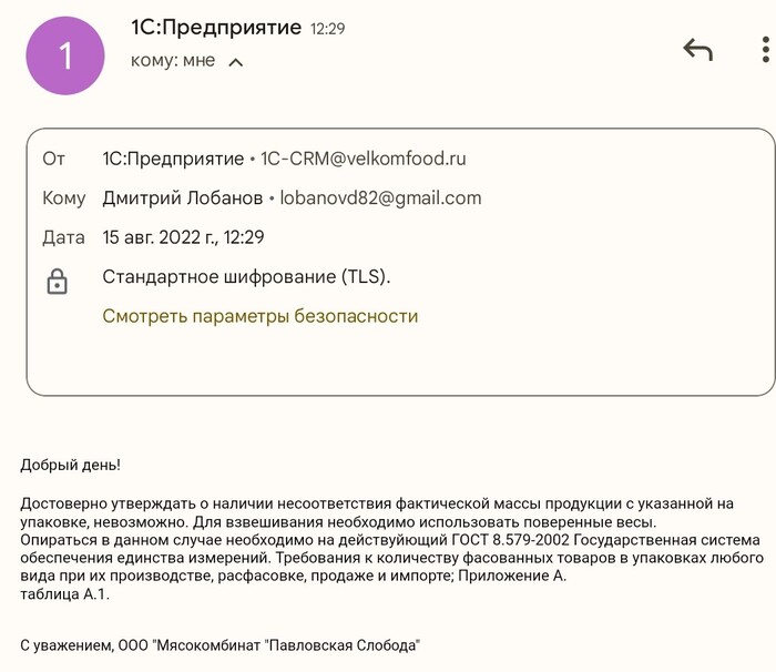 Не лень было отправить им письмо и спросить нормально ли этой. Сегодня ответили. Говорят надо взвешивать на специальных весах и читать ГОСТы! Наверное нормально такой недовес. Пошел взвешал на поверенных весах. Уточнил в магазинах. И все же не понятно нормально такой перевес или нет...
