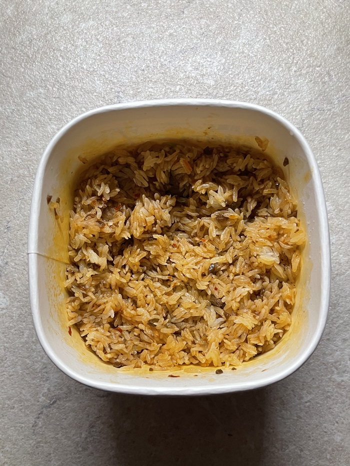 На выходе получаем вот такую порцию риса. И очень знакомый лично мне запах… запах зря потраченных денег и соуса Lao Gan Ma.