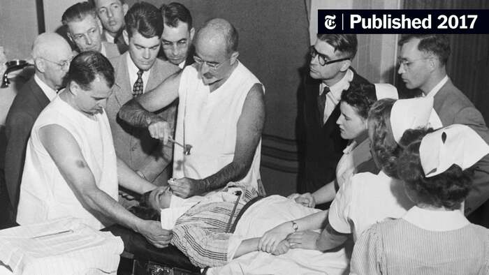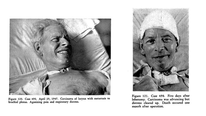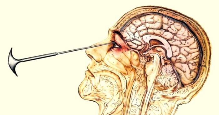 Неудачная попытка в психохирургию на совести португальского невролога Эгаша Мониш, который кстати получил за нее Нобелевскую премию в 1949 году. Идея метода заключалась в том, чтобы перерезать пути между префронтальной корой и глубинными структурами мозга, таким образом уменьшив симптомы. В лобной области сверлили отверстие и специальным инструментом (лейкотомом) пытались повредить белое вещество мозга. Позже был разработан модифицированный и упрощенный метод, трансорбитальная лоботомия, когда инструмент вводился через тонкую кость глазницы и разрушались связи между лобными долями. Данный метод можно было использовать амбулаторно, разработавший его Уолтер Фримен провел около 3500 лоботомий в США. Операция проводилась даже детям и подросткам. Эффект безусловно был - пациент становился спокойным, безразличным инвалидом. При этом смертность по некоторым данным достигала 10%, так как разрушения мозга проводились по сути наугад, то и результаты сильно разнились. Метод просуществовал около 15 лет и был запрещен в 1950х, но оставил пожалуй самый заметный след в истории психиатрии.