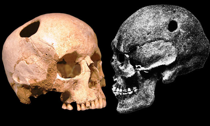 Если безумие в голове, а безумие это безусловно некий злой дух, можно попробовать его выпустить. Сделаем дырку в черепе и посмотрим, улетит злой дух или нет. Этот метод считается самым ранним, возник еще до н.э., тогда дырку аккуратно выдалбливали камушком. Позже метод развивался и в некоторых случаях даже был вполне обоснован (не наличием духов, а например внутричерепной гематомой).