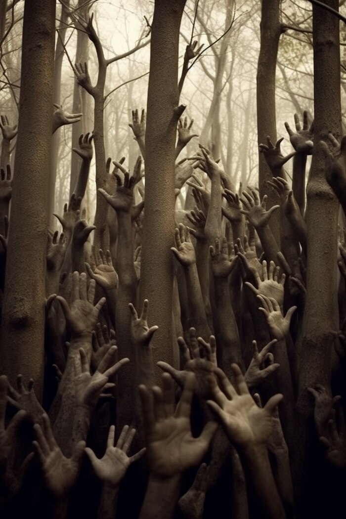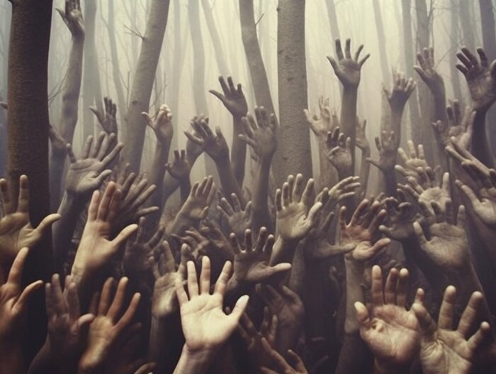 Промпт: A top-down view of a square mirror lying flat on dense, vibrant green grass shows two realistic human hands emerging through the mirror's reflective surface, reaching upward toward the viewer. The hands display contrasting skin tones, with one hand being lighter and one hand being darker. The mirror's surface creates a reversed perspective of the underside of each hand. Natural sunlight illuminates the scene, casting soft shadows on the grass. Individual grass blades surrounding the mirror exhibit hyper-detailed texture. The mirror's edges are crisp and defined against the organic patterns of the grass. Professional photography with shallow depth of field and sharp focus on the central elements under natural lighting.