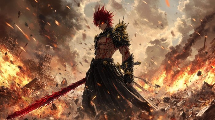 A fierce warrior with spiky crimson hair, clad in a torn black battle robe with golden embroidery, stands in the middle of a devastated battlefield. His sharp amber eyes burn with determination, and his muscular arms are covered in scars. He wields a massive katana with glowing red runes, its blade reflecting the raging fire around him. Behind him, remnants of a destroyed city are engulfed in smoke and flames, while dark storm clouds gather overhead. The air crackles with tension, and embers dance around him as he prepares for the final strike, capturing the intensity of classic shounen anime.