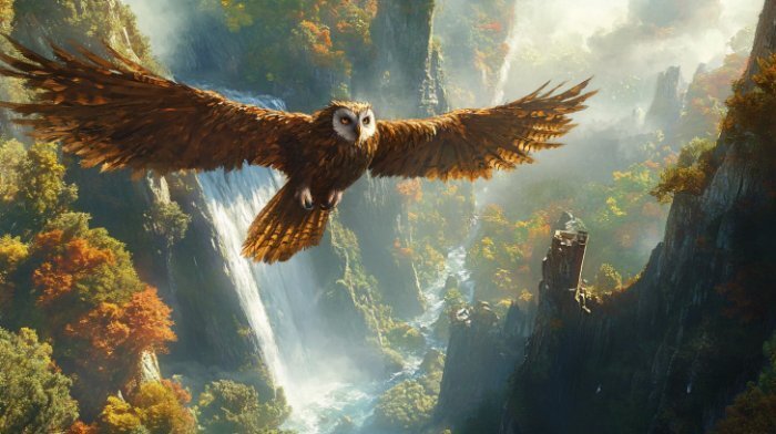 На переднем плане сова с золотистыми перьями и широко распахнутыми крыльями. За ней огромный горный водопад. Легкая дымка, деревья окрашены в зеленый и оранжевый цвета.