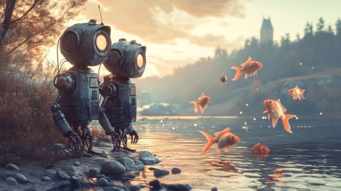 Двое влюбленных роботов на берегу реки, над поверхностью воды летают золотые рыбки, закатное небо в пастельных тонах, мягкие полутона, романтическое настроение.