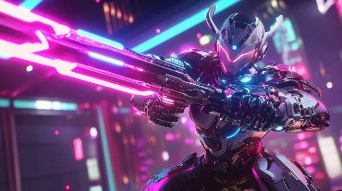 Футуристическая экипировка рыцаря с лазерным оружием, яркие неоновые акценты, киберпанк-доспехи, неоновые огни города, реалистичная детализация.