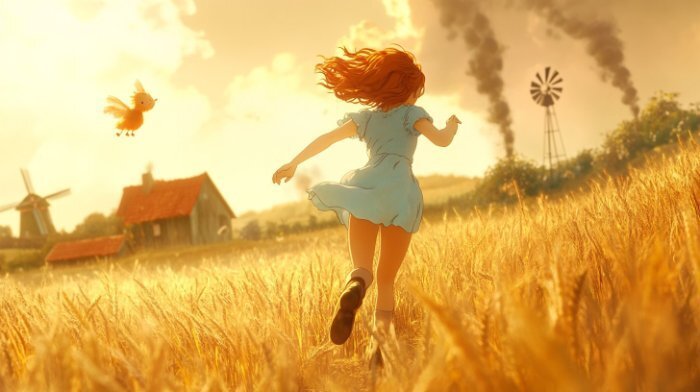 A cheerful young girl with short, messy auburn hair, wearing a blue sundress and brown leather boots, running joyfully through a golden wheat field under a pastel-orange sunset. A small, round, fluffy creature with tiny wings follows her, playfully hovering above the ground. In the background, a cozy village with wooden houses, windmills, and lush green trees is visible, with smoke gently rising from the chimneys. The warm, hand-painted textures and soft lighting create a dreamy, magical atmosphere in the style of Studio Ghibli.