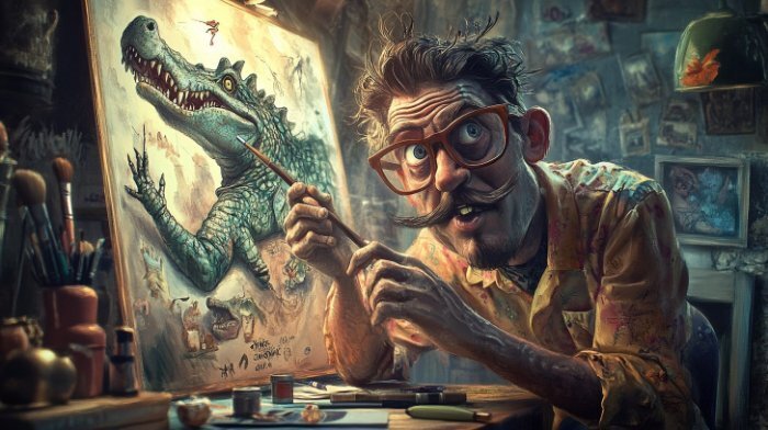 Карикатурный художник в очках, держащий в руках кисть, весь его холст покрыт рисунками сюрреалистичных крокодилов, легкий шарж, ламповая атмосфера.