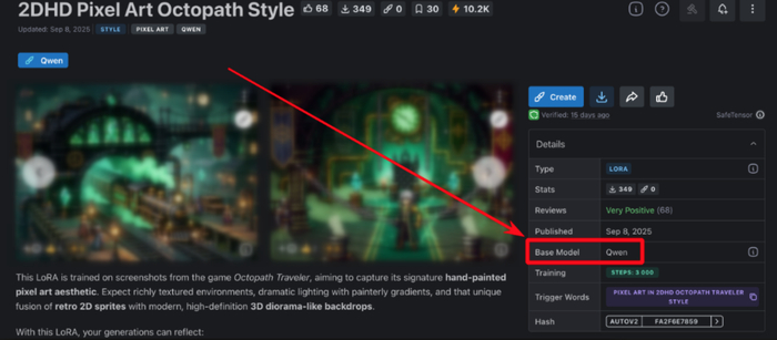 Открываете список моделей — выбираете ту, что подходит по стилю и набору функций. Не ленитесь заглянуть в описания: авторы обычно подробно разбирают, что умеет каждая LoRA-модель на практике. Как только определились, кликаете на карточку, копируете ссылку из браузера, например: https://civitai.com/models/1938784/2dhd-pixel-art-octopath-s...