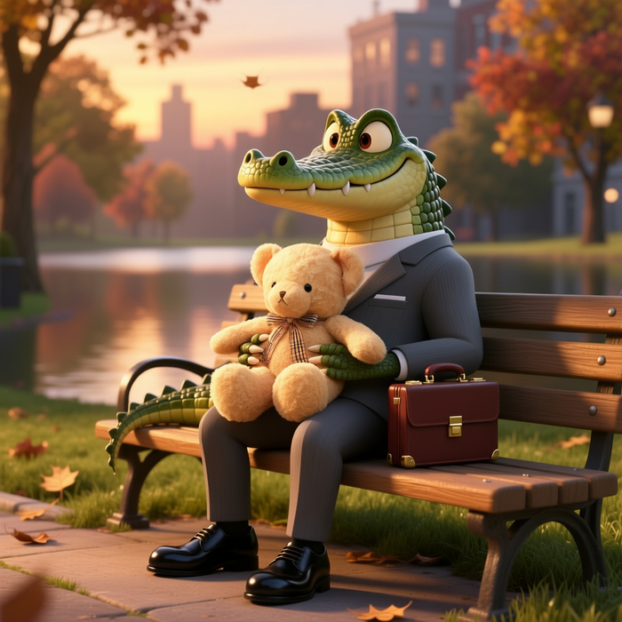 Фото мультяшного крокодила в деловом костюме, сидящего на лавочке в парке, в руке он держит яблоко, высокая детализация, высокое качество, вечер.