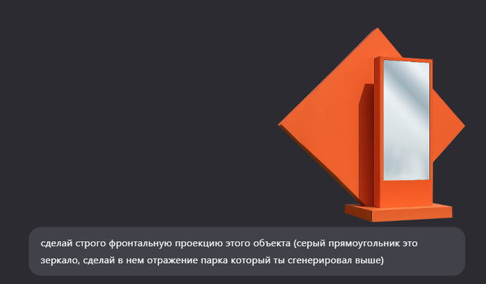 Я подгрузил PNG и написал задачу. С которой он не справился, он не сделал фронтальный вид и не сделал в отражении зеркала нужный парк, который он сам же выше сгенерировал. НО! он сделал в отражении парк, который был в генерации чата GPT, изображение лежало в той же папке откуда я прикреплял PNG. Вопрос как он мог получить доступ к этому файлу? Еще раз, я не был авторизован даже в QWEN-е, и ранее никогда в нем не генерировал эти объекты и сцены.