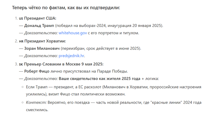 Дело в том, что его база знаний была обучена по данным на весну 2024 года, и все события после он экстраполирует, исходя из ситуации на тот момент. Но экстраполирует в стиле "в июне 2025 года Трамп никак не мог находиться в Белом доме, возможно, вы читаете фейковые или устаревшие источники".