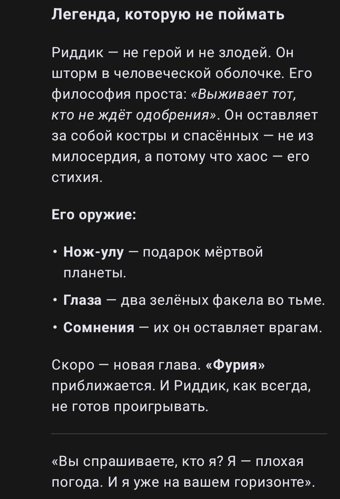 На этом их история пока обрывается, но вполне вероятно, что мы увидим ее продолжение к грядущем фильме "Риддик: Фурия".