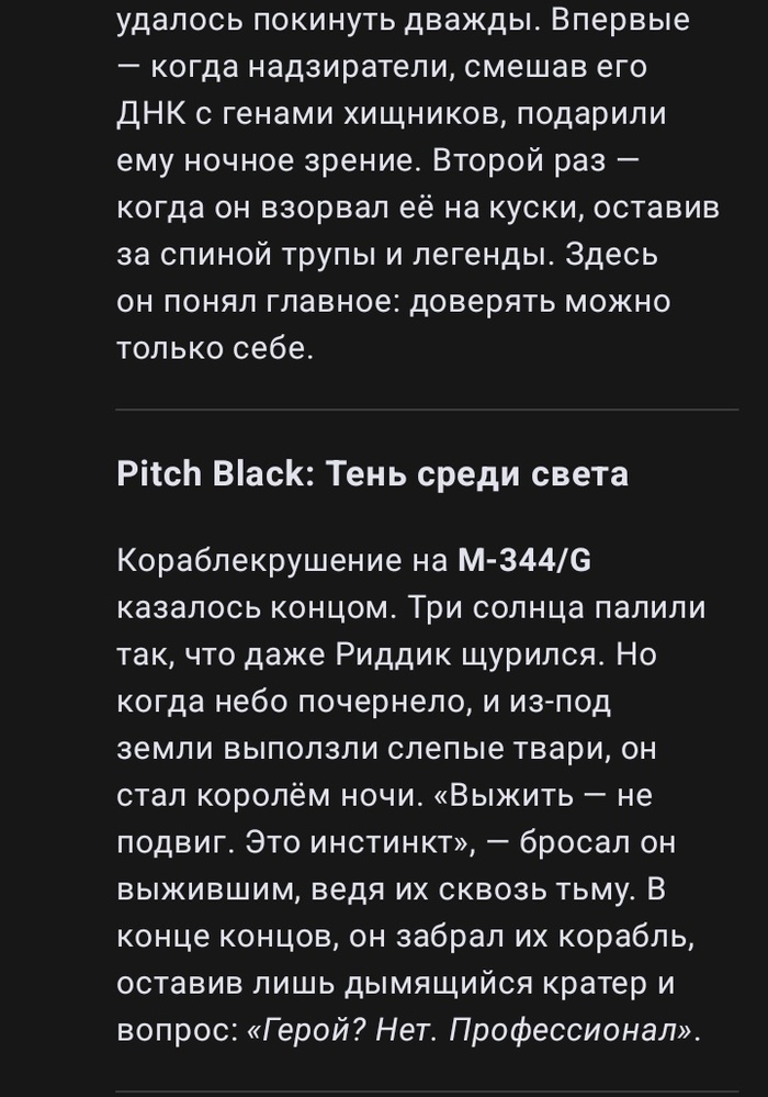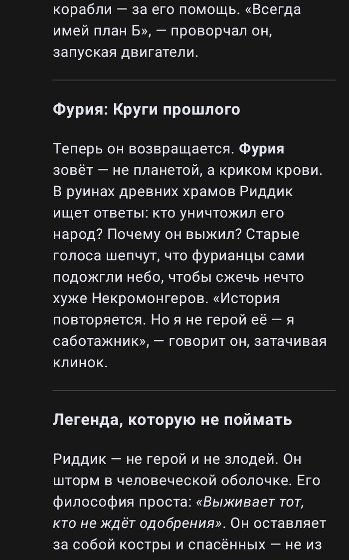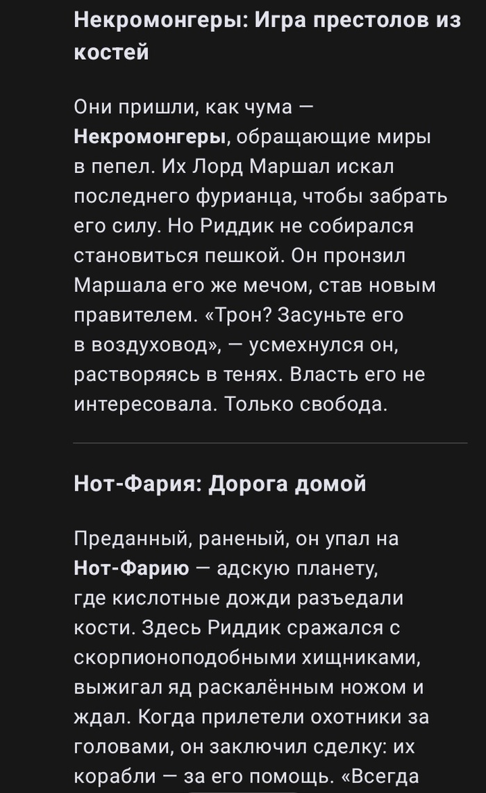 Конечно, вскоре Некромонгеры стали роптать и, несмотря на свои законы, пытаться свергнуть Риддика. Но фурианец оказался невероятно крепким и расправлялся со всеми подосланными убийцами.