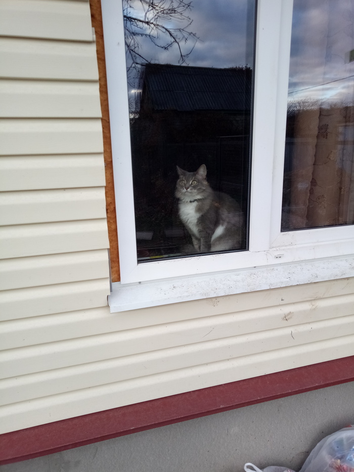 Кошка увидела соседского котика. Начала что то подозревать, видимо.