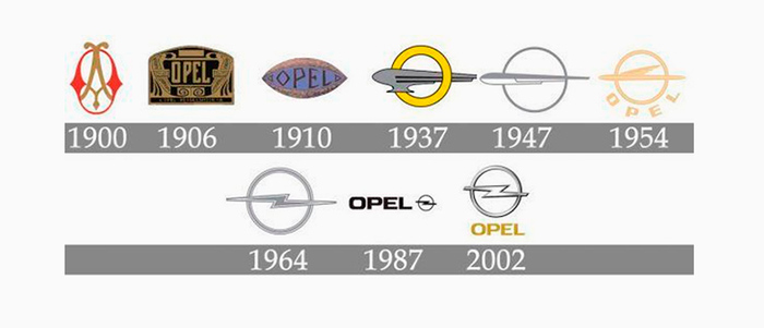 Всего эмблема Opel менялась 8 раз: в 1906, 1910, 1937, 1947, 1954, 1964, 1987 и 2002 годах. Особенно интересна перемена логотипов на заре развития марки. Первая версия торгового знака, появившаяся в 1900 году, представляет собой стилизованную анаграмму имени Адама Опеля – отца-основателя кампании. Состоящая из двух заглавных букв, она выполнена каллиграфически, а значит, герр Опель для идентификации своего продукта на рынке прибегал к услугам профессионального художника.