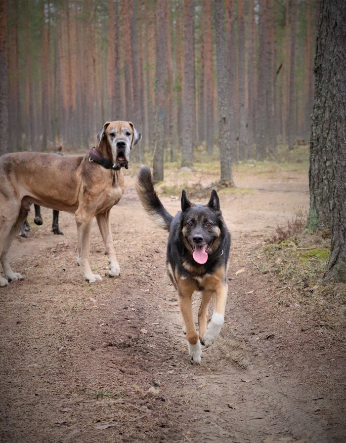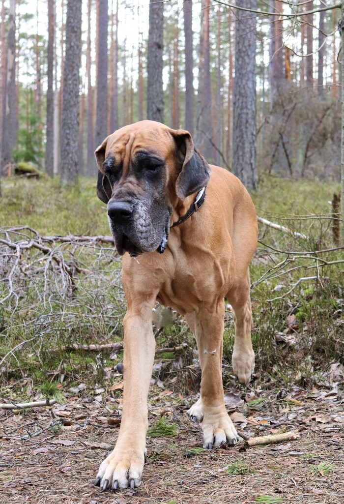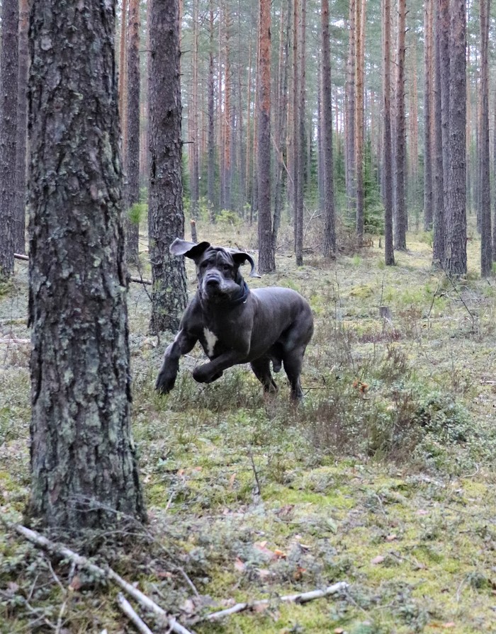 Живем мы почти в центре города, в квартире, но у нас есть где нормально их выгуливать, учитывая то, что доги не требуют больших нагрузок. Раз-два в неделю выезжаем в лес как следует продышаться и пробегаться. На одной из таких прогулок и сделаны эти фото.