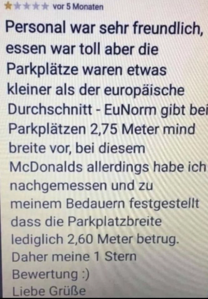 Персонал очень дружелюбный, еда классная, но парковочные места немного меньше, чем в среднем по Европе - европейская норма требует для парковок минимум 2,75м в ширину, в этом Макдональдсе, я замерил, и к моему сожалению, ширина парковки составила всего 2,60м. Поэтому одна звезда:)