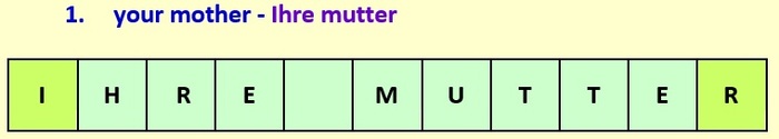 Данная карточка - для изучения немецкого языка при родном английском. Но для объяснения принципа это не важно. Вверху - английский перевод "Your mother". В нижней строке - "мусор из букв" немецкого варианта фразы. На зеленом фоне - правильно расположенные немецкие буквы. Это подсказка с чего должно начинаться и чем должна заканчиваться фраза на немецком. А остальные буквы перемешаны. В фразе есть пробел.